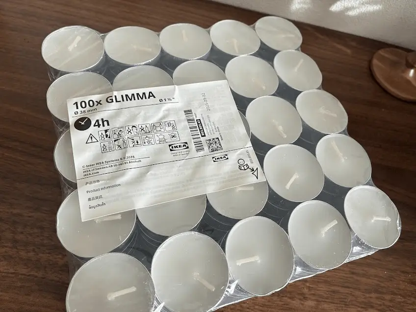 元々は、本物のティーキャンドルを購入しに行ったのですが、LEDライトと100個入りのティーキャンドル(999円)、両方購入しました。本物のティーキャンドルの燃焼時間は4時間なので、圧倒的にLEDキャンドルの方がコスパは良いです。
