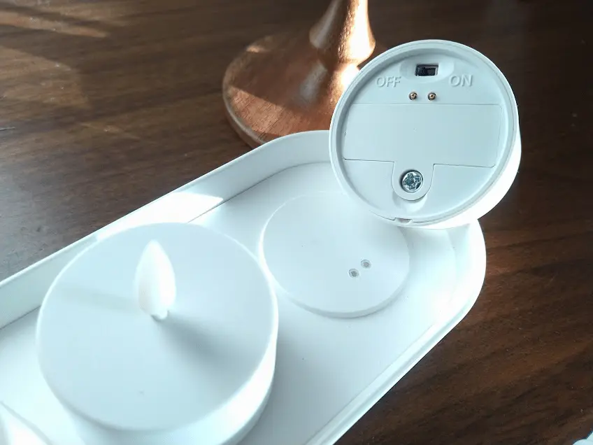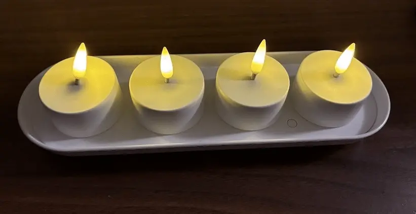 さらに、ティーライトをチャージトレイの上に置いた状態でトレイのボタンを押すと、バッテリーの残量を確認できます。満充電の場合は1回点滅し、まだ充電が必要な場合は3回点滅します。