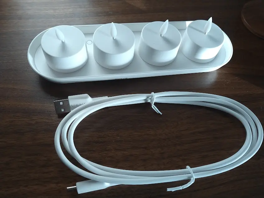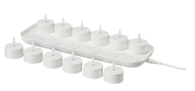 IKEAで販売されている「SKATGÅS スカットゴース」という充電できるLEDティーライトキット。