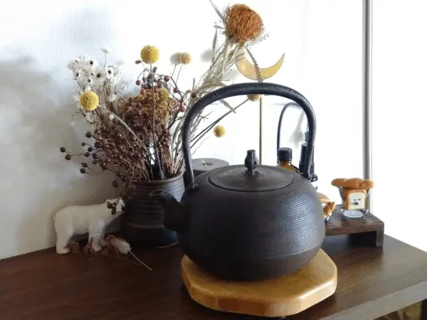 こちらは、我が家の鉄瓶。キッチンは狭くて置き場所がないので、リビングに置いていますが、違和感もなく部屋に馴染んでいてインテリアのようになっています。