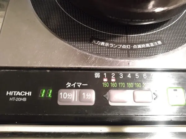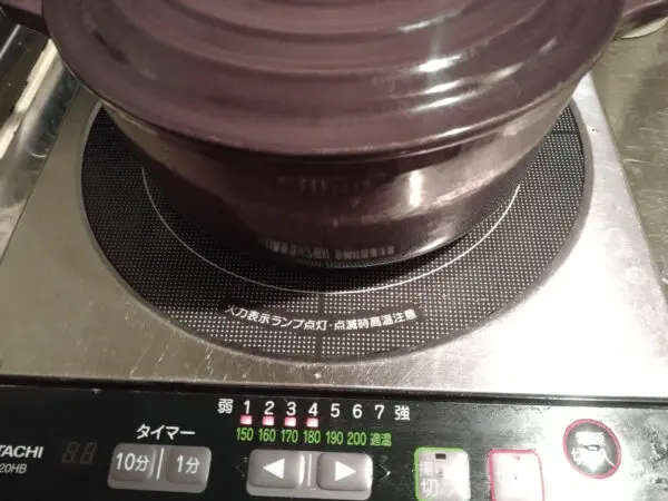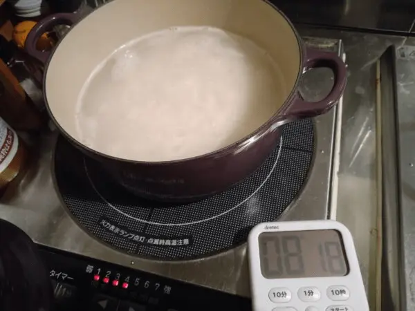 4.ぐつぐつ言って沸騰したら、弱火(IHなら160度のメモリ)にして蓋をして11分火にかける。