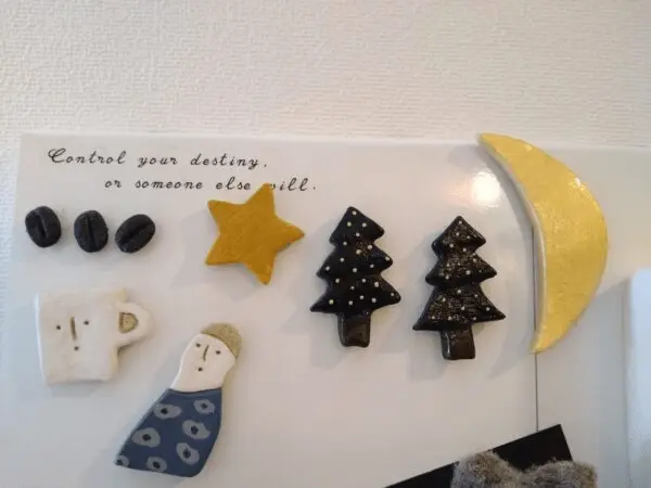↓オーブン粘土で作った、マグネットです。星形はクッキー型を100均で購入し、抜いたもの。オーブン粘土は作りたい形に成形し、数日乾燥させた後、オーブンで焼いて色付けをしたら完成! とても簡単。