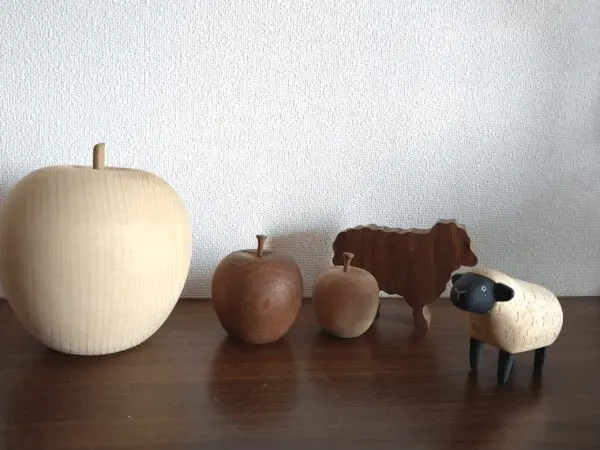家具は全て木製なので、木製のインテリアはお部屋に馴染みます。中、小のリンゴは、ペーパースタンドです。