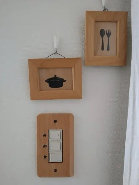 スィッチカバーもフォトフレームもセリアで購入したもの。木は、暖かさや温もりを感じます。
