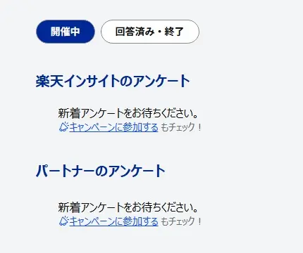 アンケートが表示されて、時間が経過したアンケートは、アンケート一覧に表示されていても「このアンケートは終了しております」等のメッセージが表示され回答出来ないこともあります。