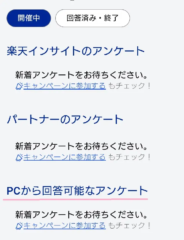 スマホからログインすると、「PCから回答可能なアンケート」が表示され、回答可能なアンケートが表示されても、スマホからは回答することが出来ないので注意が必要です。