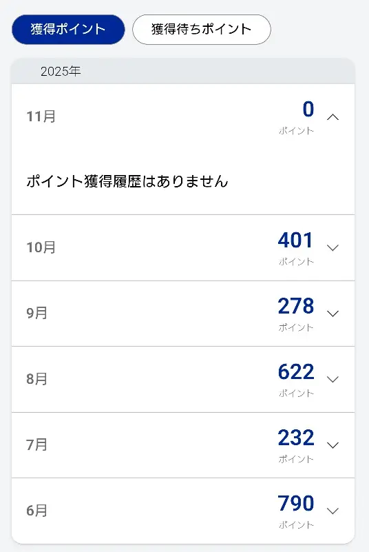 獲得待ちポイントは「ポイント履歴」より確認することができますが、獲得数は確認することができません。