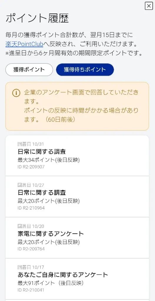 ・ポイントが回答後すぐに反映されない場合がある。(60日前後で反映)