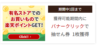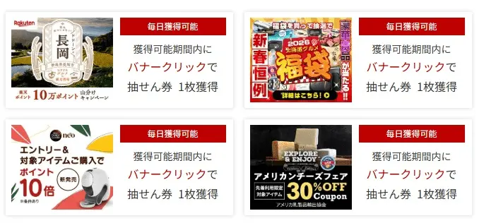 ※バナーをクリックしてゲットする抽せん券は、毎日クリックするともらえる抽せん券と、期間中1回まで のものがある。