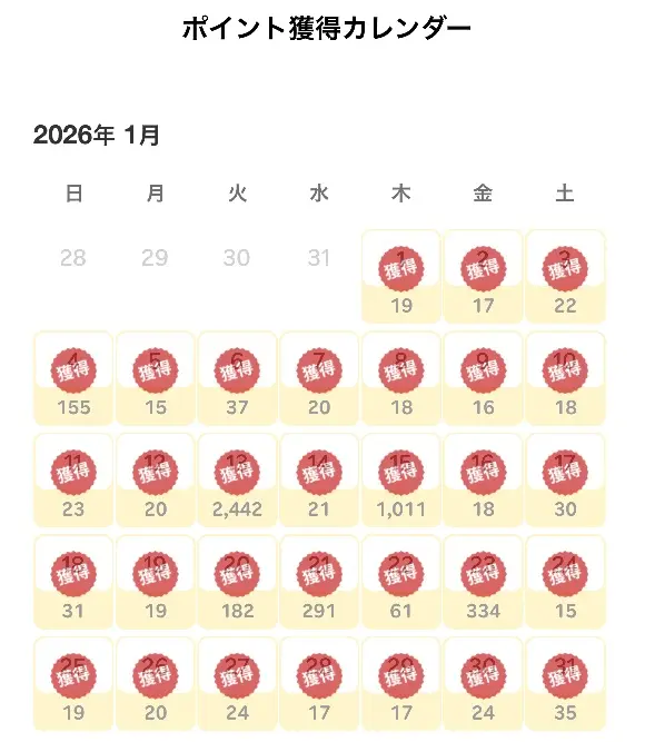 2026年1月のポイント実績(※お買い物ポイントを含んだポイント数) 4,991ポイント!