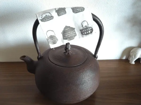 これも蓋をつかみやすいサイズにカットし、縫って使っています。鉄瓶柄がまたかわいいです。