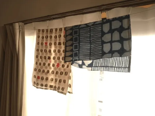 夜洗ってかけておけば、朝にはすっかり乾いています。これが布巾だったら、乾かないと思うので、やはり手ぬぐいは便利で使い易いです。