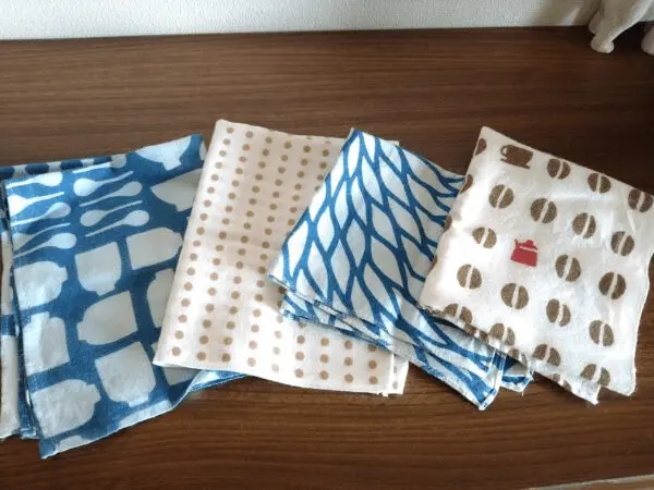 手ぬぐいは縦に長いタイプが多いと思いますが、私はそれを3等分位に裁断して使っています。結果、1枚から3枚分の食器拭きが出来る。これって、コスパがかなりいいと思います。