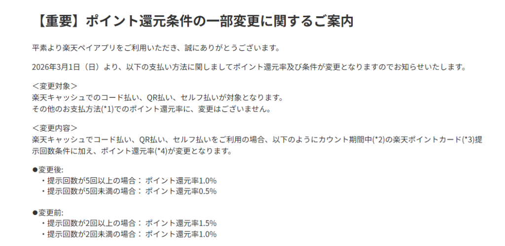 ※2026年3月1日から予定していた楽天キャッシュでの支払いにおけるポイント還元条件の変更を見送ると発表した。理由は「準備の都合」によるもので、今後変更が発生する場合は改めて案内するとしている。