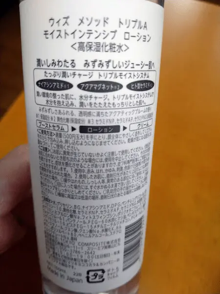 商品の後ろにも「高保湿化粧水」や「潤い」といった表記があるので、保湿に特化した商品である。と言えそうですね。それに「しみ」「シワ改善」に効果もありそうなので、これからも暫く使ってみようと思います。