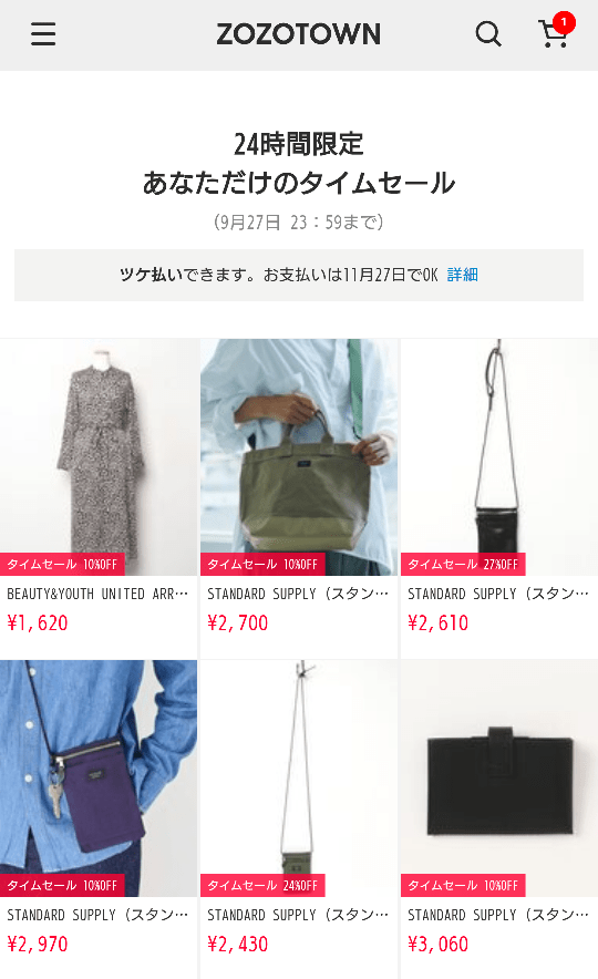 サイトに掲載されたばかりの商品は、値下げはあまりないのですが、数日経過した商品は、タイムセールで安く購入できるものもあります。タイムセール以外にも、掲載されてから時間が経過した商品の中には、〇%オフに値下げされているものもあります。